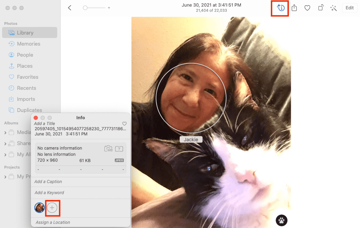 In the app, make sure you have View > Show Face Names enabled. Then go to a photo that includes your beloved Fido or Fluffy and click the Info button (the first icon at the upper right of the Photos window). There you will see the recognized face (or faces if there’s more than one) and another plus (+) sign inside a blank circle.