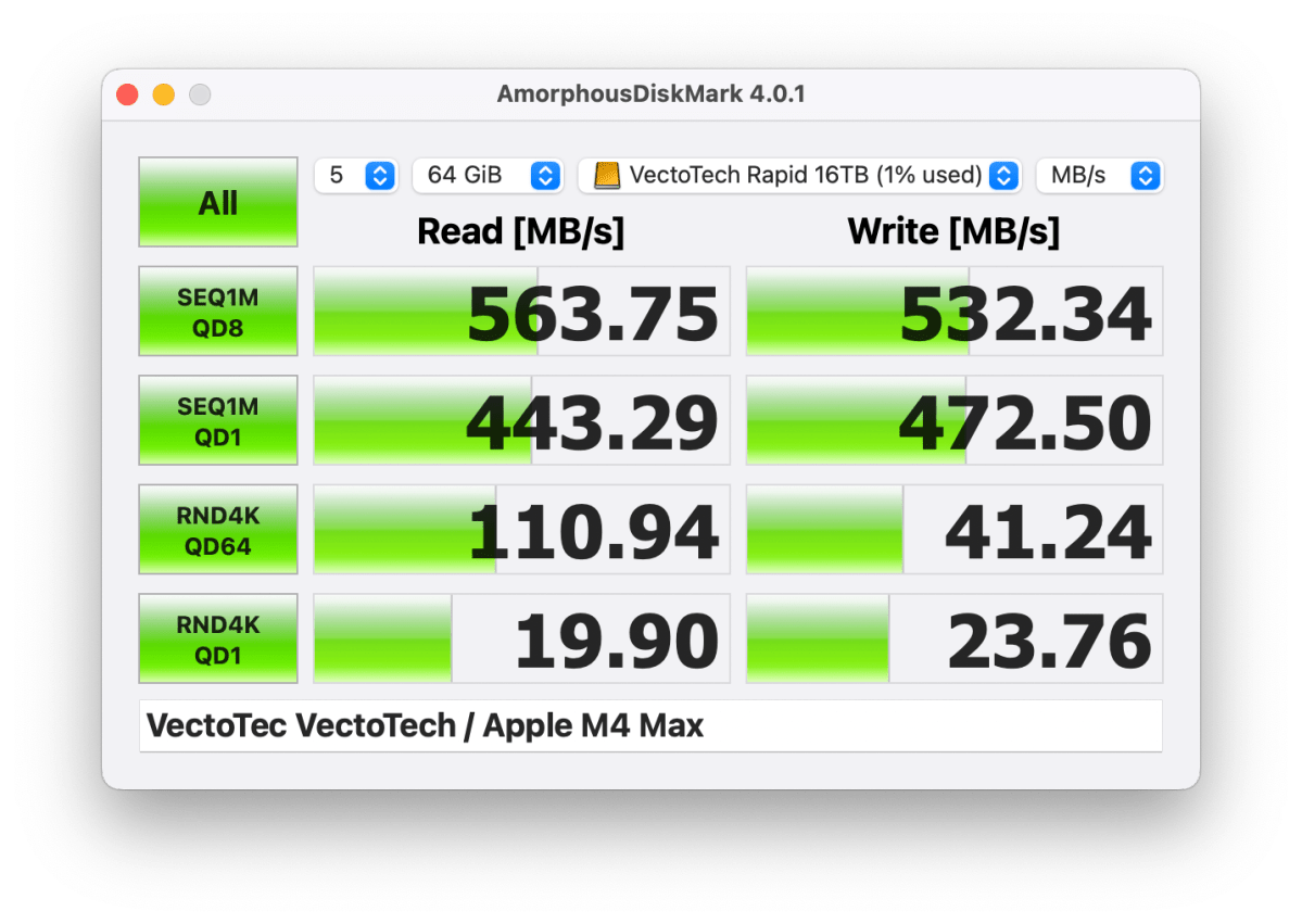 Compared to an HDD, the VectoTech Rapid is very fast. Compared to even slow 10Gbps SSDs, that would be, not so much. Around 500MBps to 550MBps both reading and writing. But that’s sustained throughput and only part of the story.